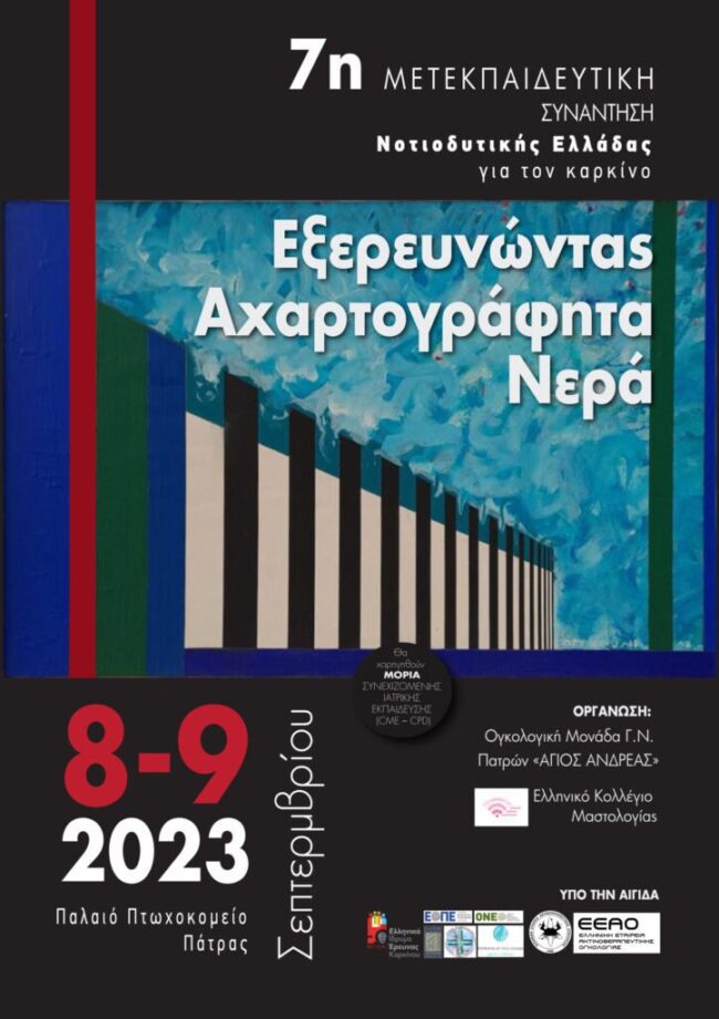7η Μετεκπαιδευτική Συνάντηση Νοτιοδυτικής Ελλάδας για τον Καρκίνο: Εξερευνώντας Αχαρτογράφητα Νερά | 8-9 Σεπτεμβρίου, Παλαιό Πτωχοκομείο, Πάτρα, υπό την αιγίδα της Ελληνικής Εταιρείας Χειρουργικής Ογκολογίας