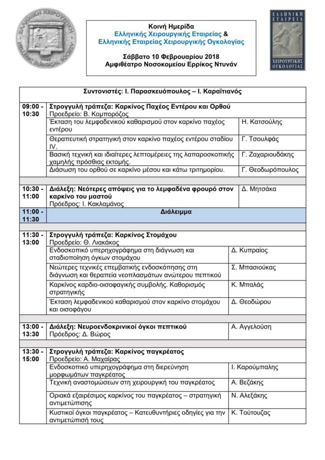 Αγαπητοί συνάδελφοι, φίλες και φίλοι,Η Ελληνική Εταιρεία Χειρουργικής Ογκολογίας (ΕΕΧΟ), το Σάββατο 28/2/2026 στο Αμφιθέατρο του Νοσοκομείου Ερρίκος Ντυνάν, θα πραγματοποιήσει την διαδραστική ημερίδα: “Σαρκώματα & Στρωματικοί Όγκοι του Γαστρεντερικού”.Η εκδήλωση συμπίπτει με την Παγκόσμια Ημέρα Σπανίων Νόσων καθώς πρόκειται για σπάνιους όγκους η διαχείριση των οποίων, τόσο σε επίπεδο διάγνωσης όσο και θεραπευτικής αντιμετώπισης, απαιτεί εξειδικευμένη γνώση και συνεργασία…