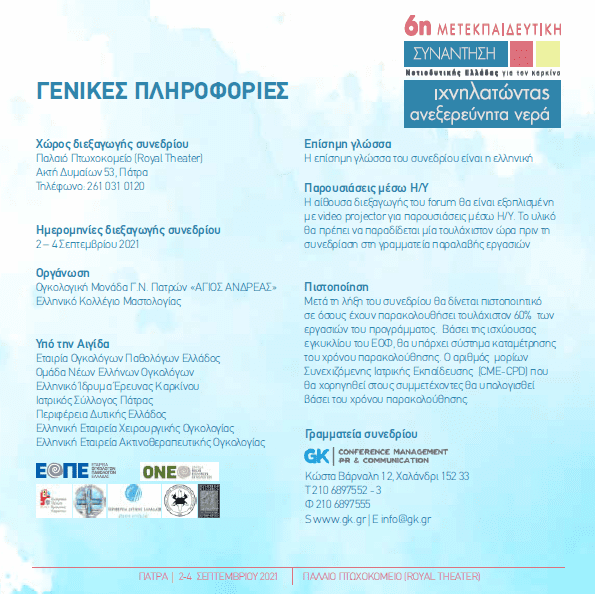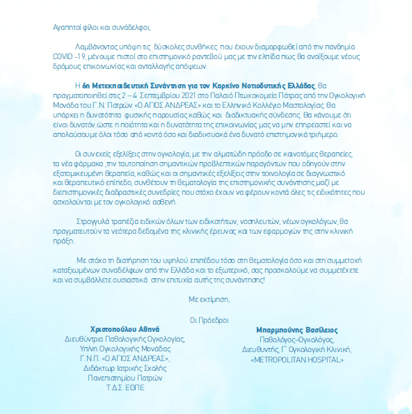 Από τις 2 έως τις 4 Σεπτεμβρίου 2021 η Ογκολογική Μονάδα Γ.Ν. Πατρών «ΑΓΙΟΣ ΑΝΔΡΕΑΣ» και το Ελληνικό Κολέγιο Μαστολογίας, υπό την αιγίδα και της Ελληνικής Εταιρείας Χειρουργικής Ογκολογίας, διοργανώνουν την “6η Μετεκπαιδευτική Συνάντηση για τον καρκίνο Νοτιοδυτικής Ελλάδας. Ιχνηλατώντας ανεξερεύνητα νερά” στο Παλαιό Πτωχοκομείο (Royal Theater)στην Πάτρα.