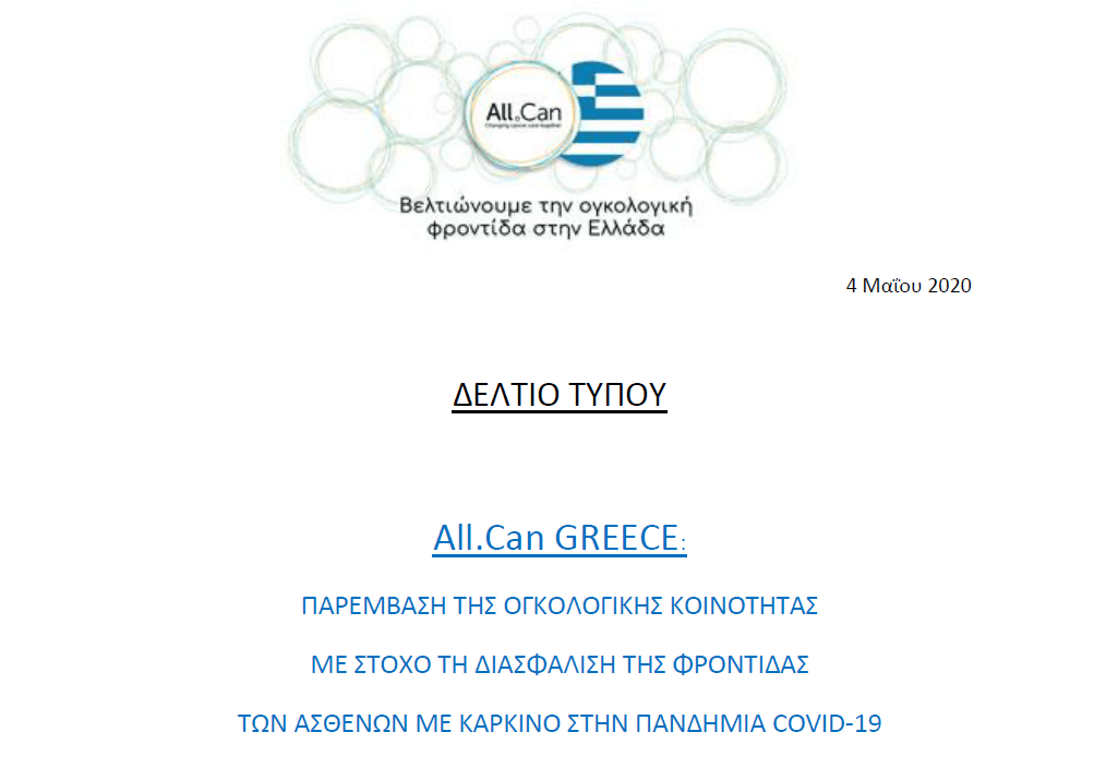 Δελτίο Τύπου All.Can GREECE: Παρέμβαση της Ογκολογικής Κοινότητας με στόχο τη διασφάλιση της φροντίδας των ασθενών με καρκίνο στην Πανδημία Covid-19